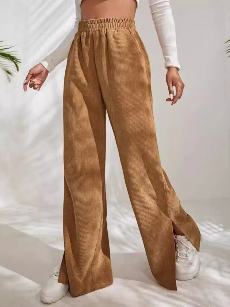 מכנסי קורדרוי שמשלבים רכות, סטייל ותחושת חופש מושלמת. בד קורדרוי רך ועשיר שמעניק מגע נעים לעור, גזרה משוחררת נוחה לתנועה חופשית, ושסעים העדינים המוסיפים טאץ' מחמיא ללוק שלך.