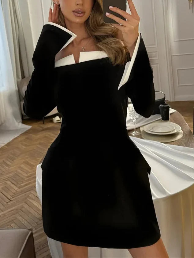 שמלת מיני אלגנטית עם גזרה מחמיאה, כתפיים חשופות ועיטורי קונטרסט לבנים. עשויה מבד נמתח בעדינות, עם שרוולים ארוכים וכיסים דקורטיביים. מתאימה לערב, אירועים ומסיבות.