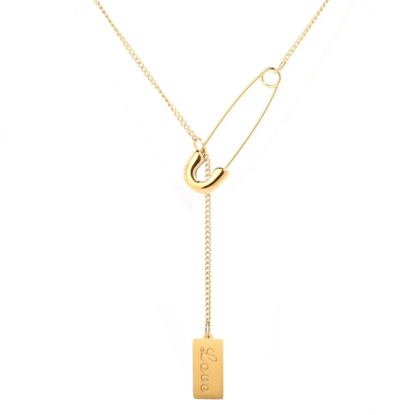 שרשרת צ'וקר פלדת אל חלד בצבע זהב בשילוב סיכת בגדים חרוטה במילת Love.