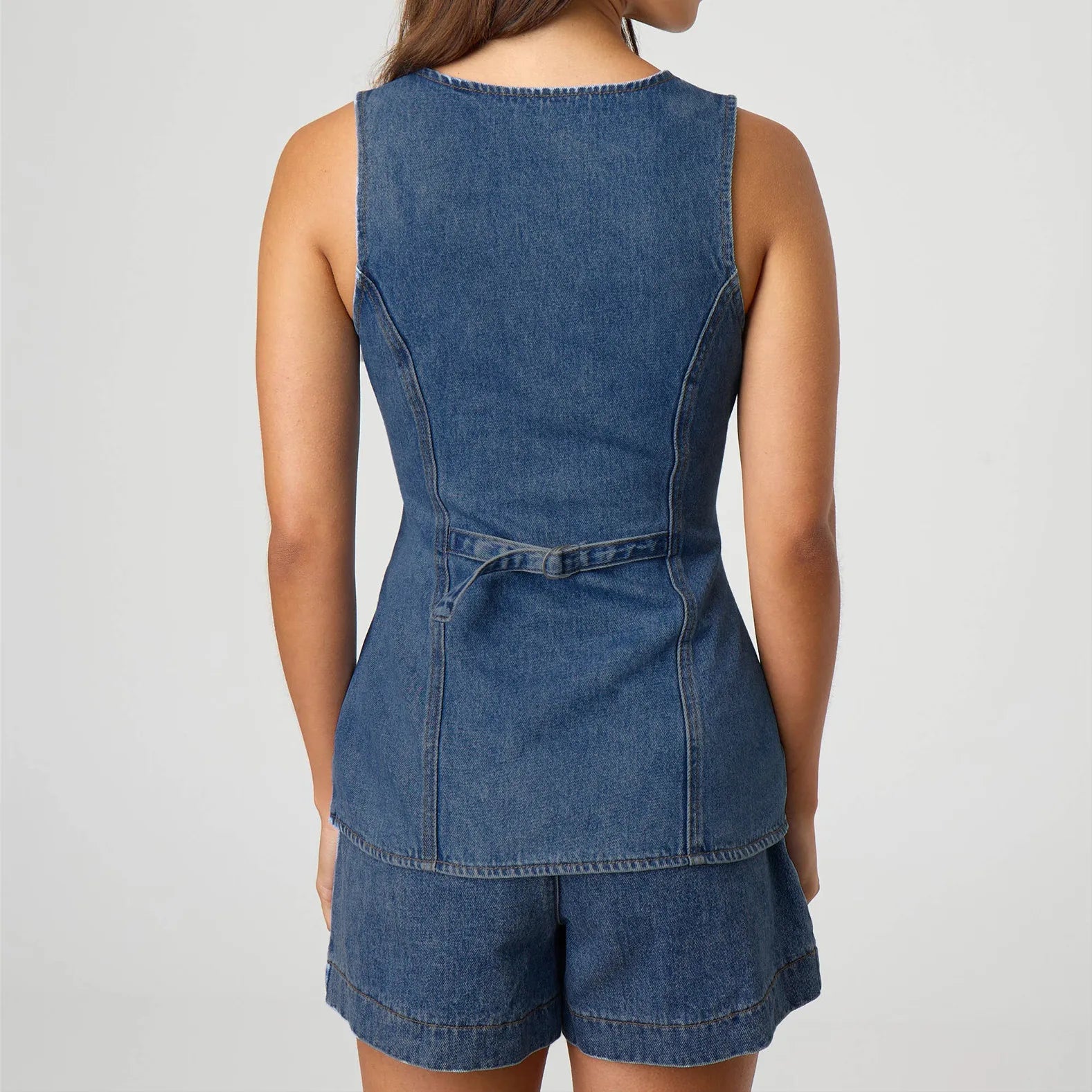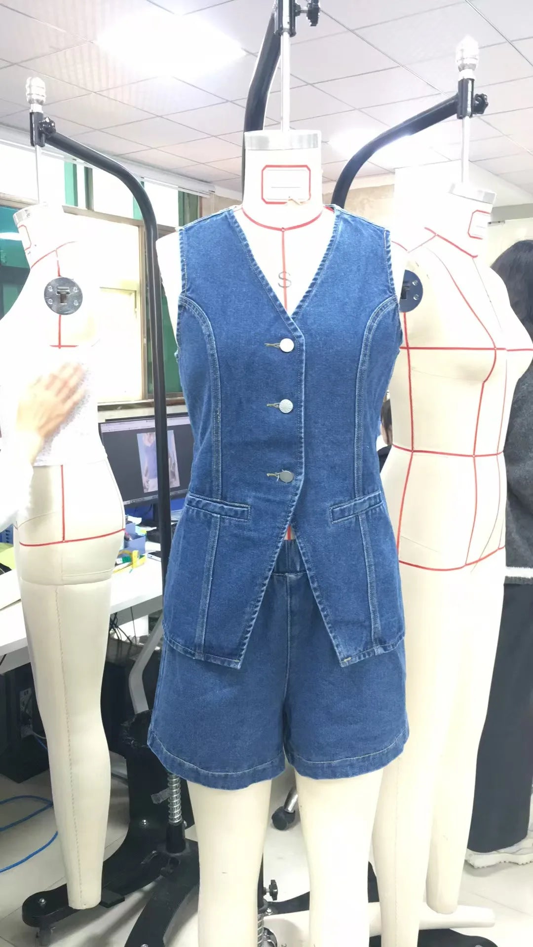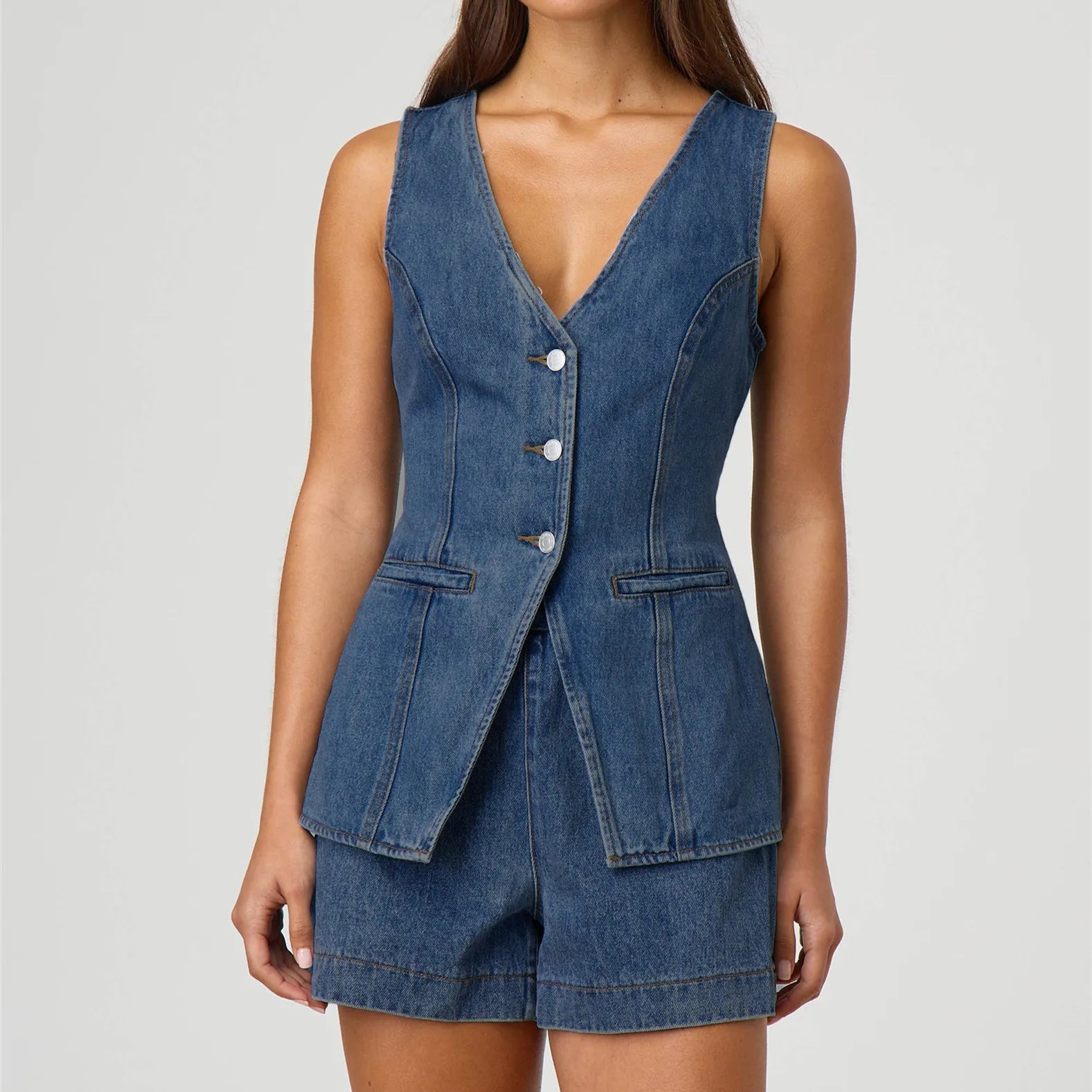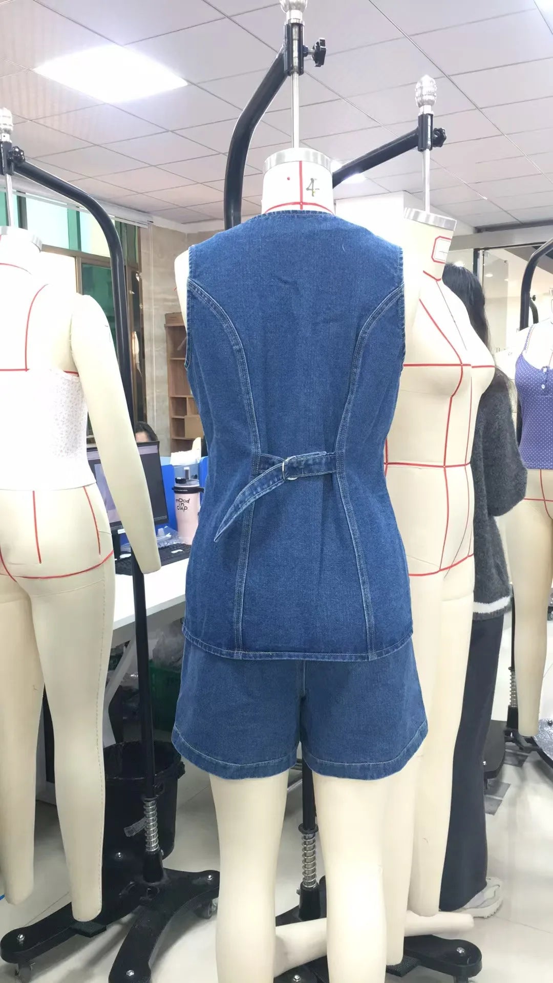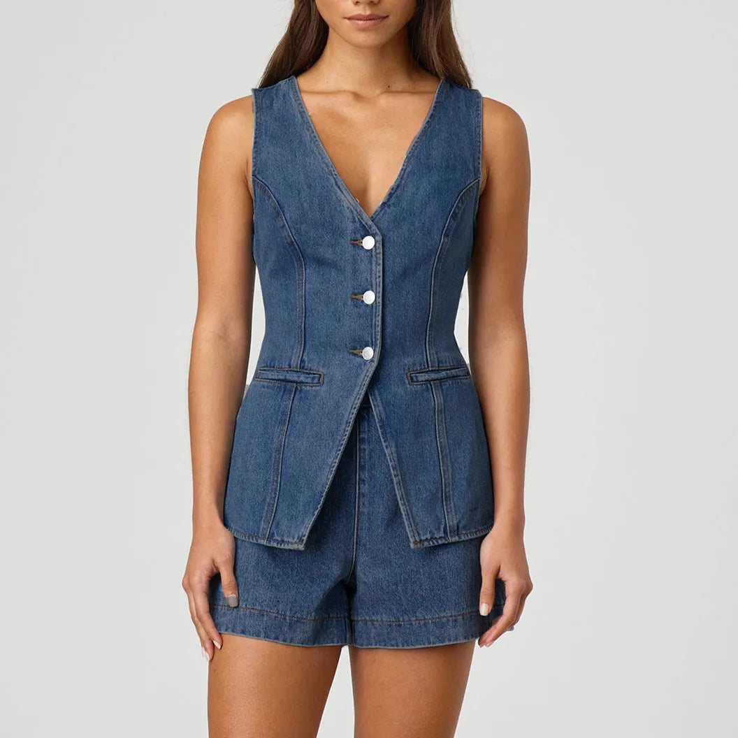 סט ג'ינס אלגנטי וייחודי המשלב גופייה מחויטת עם כפתורים ומכנסיים קצרים בגזרת ברמודה. גזרה מחמיאה שמדגישה את המותן עם מחשוף וי מחודד – לוק קייצי בסטייל משרד מודרני או יציאה אלגנטית.