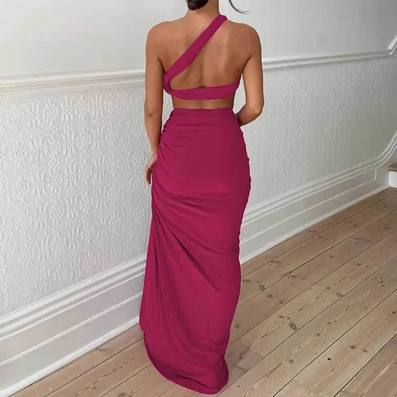 סט נשי קיצי עם טופ גזור א-סימטרי וחצאית ארוכה עם שסע עמוק – מושלם לאירועים וחופשות.
