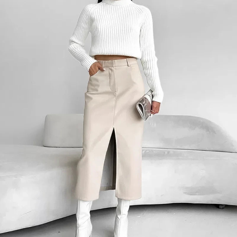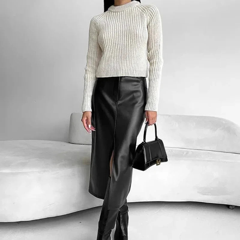 חצאית מידי עור מלאכותי לנשים במותן גבוה - בעיצוב ישר עם שסע בחלקו הקדמי. בעיצוב רחובי וסטיילי.