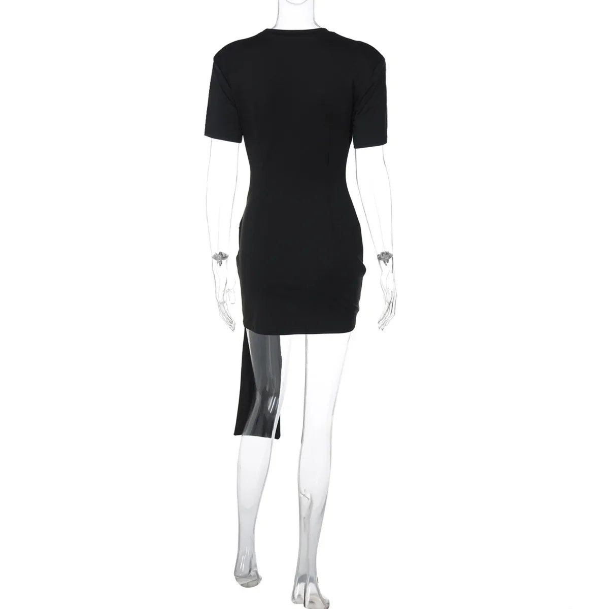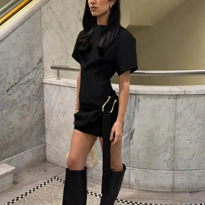שמלת מיני צמודה עם שרוולים קצרים, עיטוף צדדי ואבזם מתכתי דקורטיבי. עיצוב ייחודי ואלגנטי, מושלם לערב וליציאות.