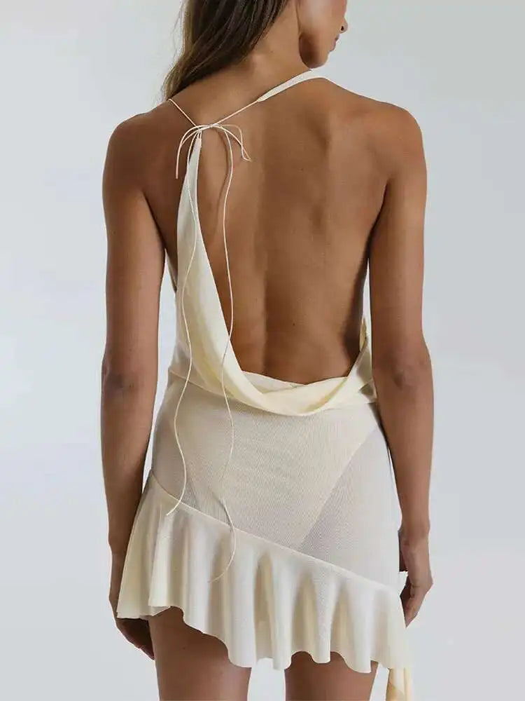 השמלה כוללת עיצוב חסר גב סקסי, עם מחשוף V עמוק וקשירה בצוואר.