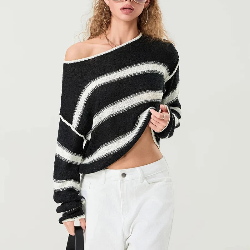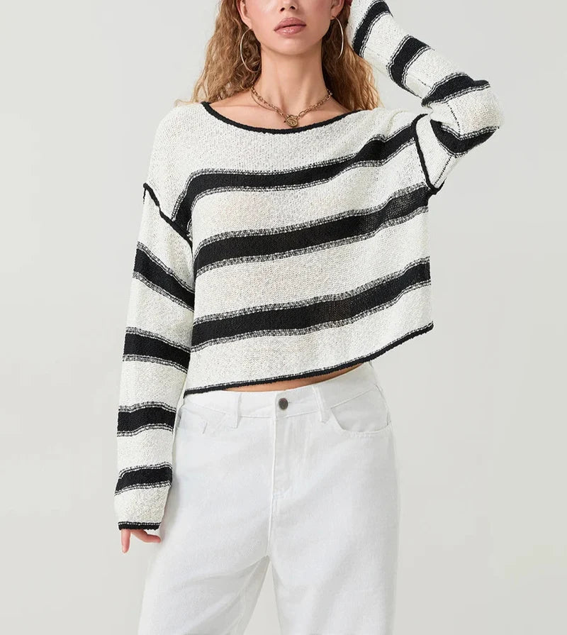 סוודר קז'ואלי לנשים לעונת הסתיו, בעל שרוולים ארוכים וצווארון עגול. עם עיצוב רפוי והדפס פסים, הוא מציע נוחות וסטייל בכל יציאה.