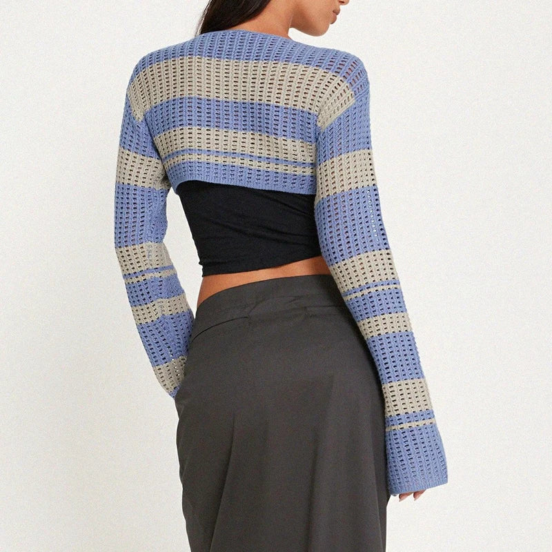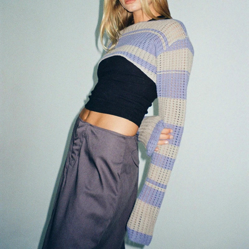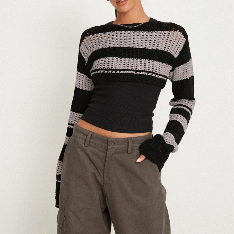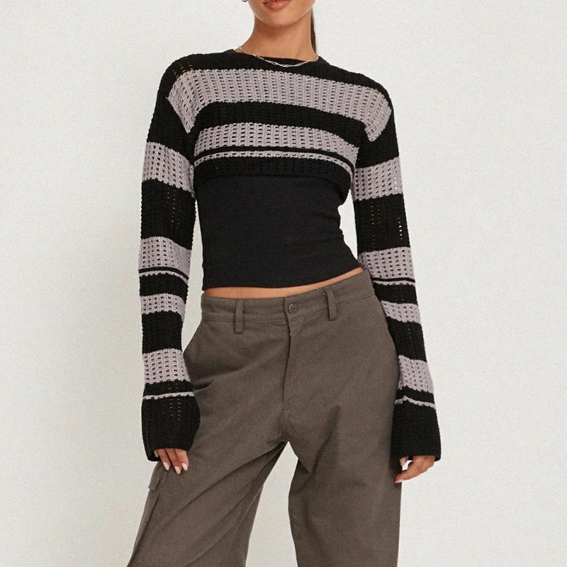 סוודר קרופ סרוג בגזרת יוניסקס עם פסים שחור-אפור בעיצוב עדין ומודרני. עשוי מבד קליל ונושם עם אלסטיות קלה, מושלם למראה יומיומי בעונות המעבר.