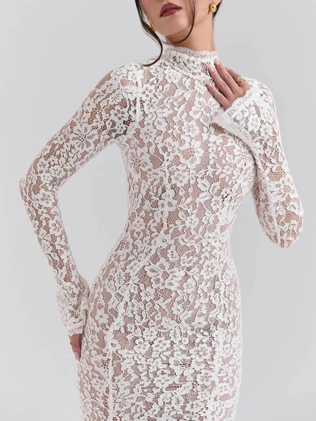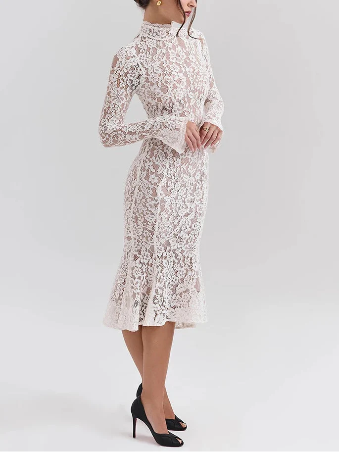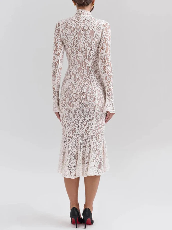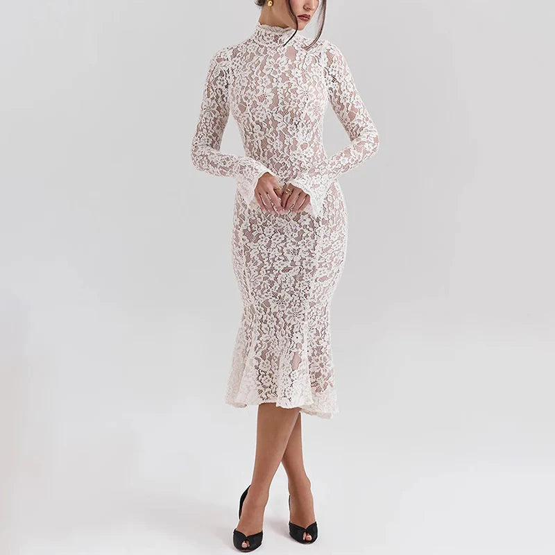 שמלת מידי אלגנטית ומחטבת עשויה תחרה שקופה, עם שרוולים ארוכים וצווארון חצי גבוה למראה נשי ומתוחכם. מתאימה לאירועים מיוחדים, מסיבות וערבי חורף אלגנטיים.